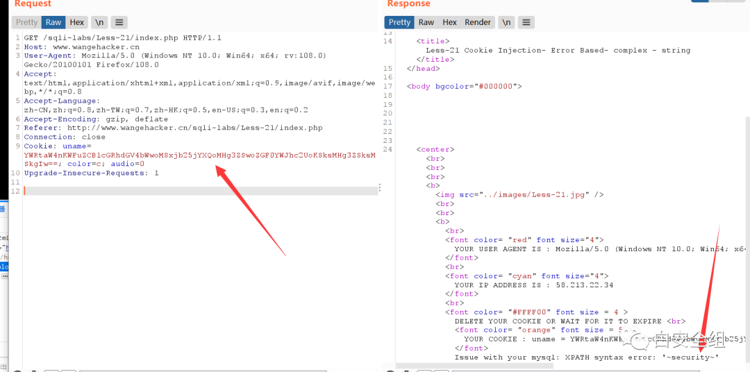 'and updatexml(1,concat(0x7e,(database()),0x7e),1)#less-21cookie注入: