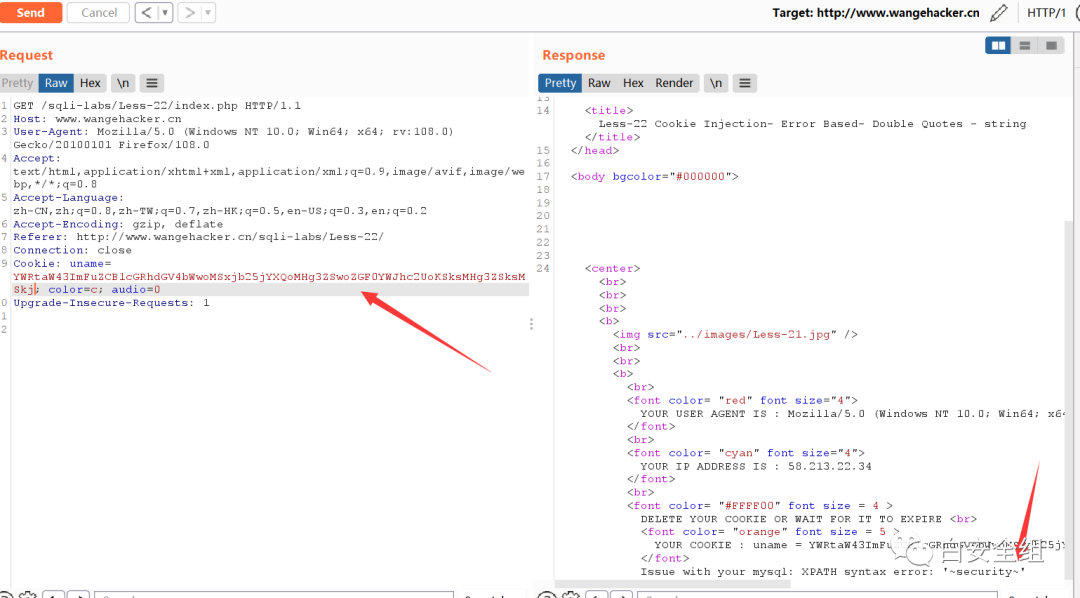 admin')and updatexml(1,concat(0x7e,(database()),0x7e),1) #加密成base64less-22cookie注入: