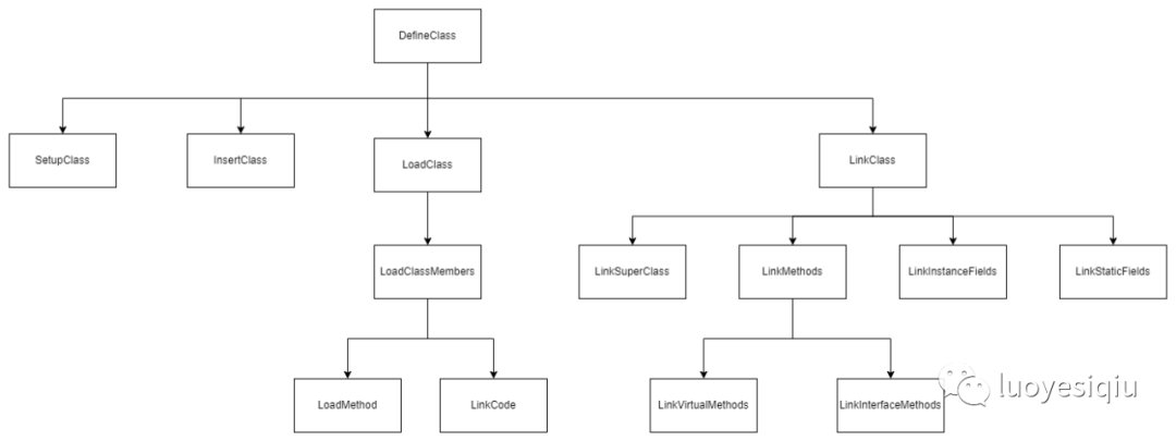LinkClass中调用LinkSuperClass、LinkMethods、LinkInstanceFields和LinkStaticFields这些函数。接着给h_new_class_out分配一个值。这个值返回到DexFile_defineClassNative转成jclass,jclass到Java层就变成了java.lang.Class