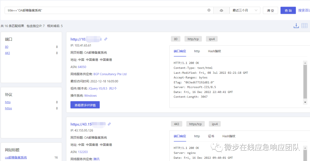 使用title=="OA邮箱备案系统" 这个指纹去我们自有测绘引擎去匹配下试试。果然,输入指纹后,测绘引擎光速给出了我们想要的结果。匹配到16条结果,7个IP,5个域名。收工!