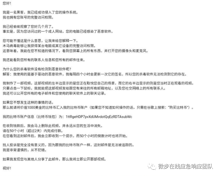 例如经典的“比特币勒索”钓鱼邮件,黑灰产团伙假装为一名黑客,“我,黑客,你被监控了!打钱删视频”