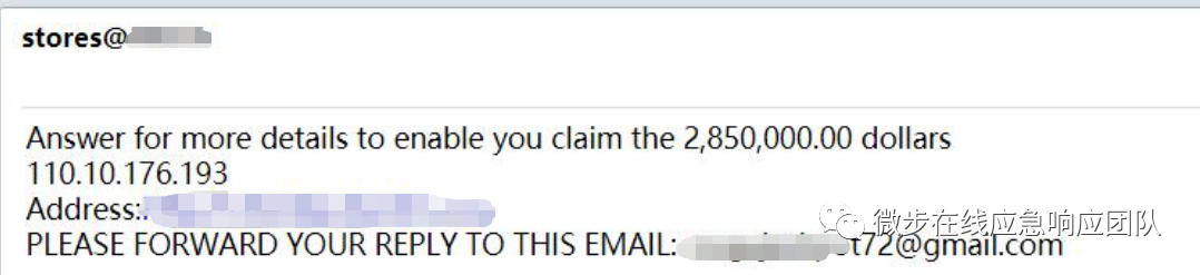 再比如某段时间流行的“419”诈骗钓鱼邮件,正文内容翻译过来意为:“你有285万美元赔偿,赶紧回复我领取吧”,用此类诱惑性话术吸引受害者,如果回复,就可能会陷入诈骗骗局中。