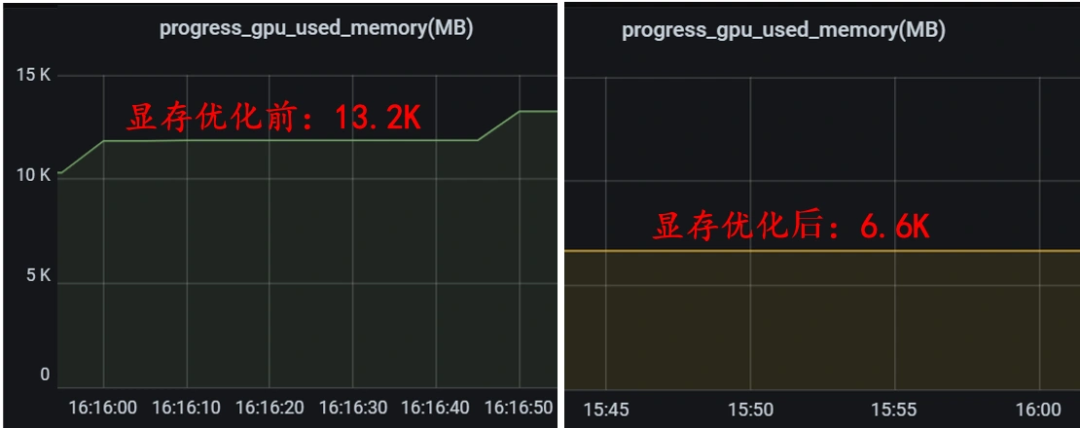 显存管理主要就是解决上述问题,主要思想是解耦合显存占用大小跟服务并发路数之间的关系,提高并发路数不再导致显存增大,进而提升服务整体吞吐量;并且由服务路数实现并行方式转换为不同模型之间并行方式,提高了 GPU 计算的并行度,更好的充分利用 GPU 资源。以通用 OCR 为例,下图可以看使用前后 GPU 利用率变化和显存占用变化。