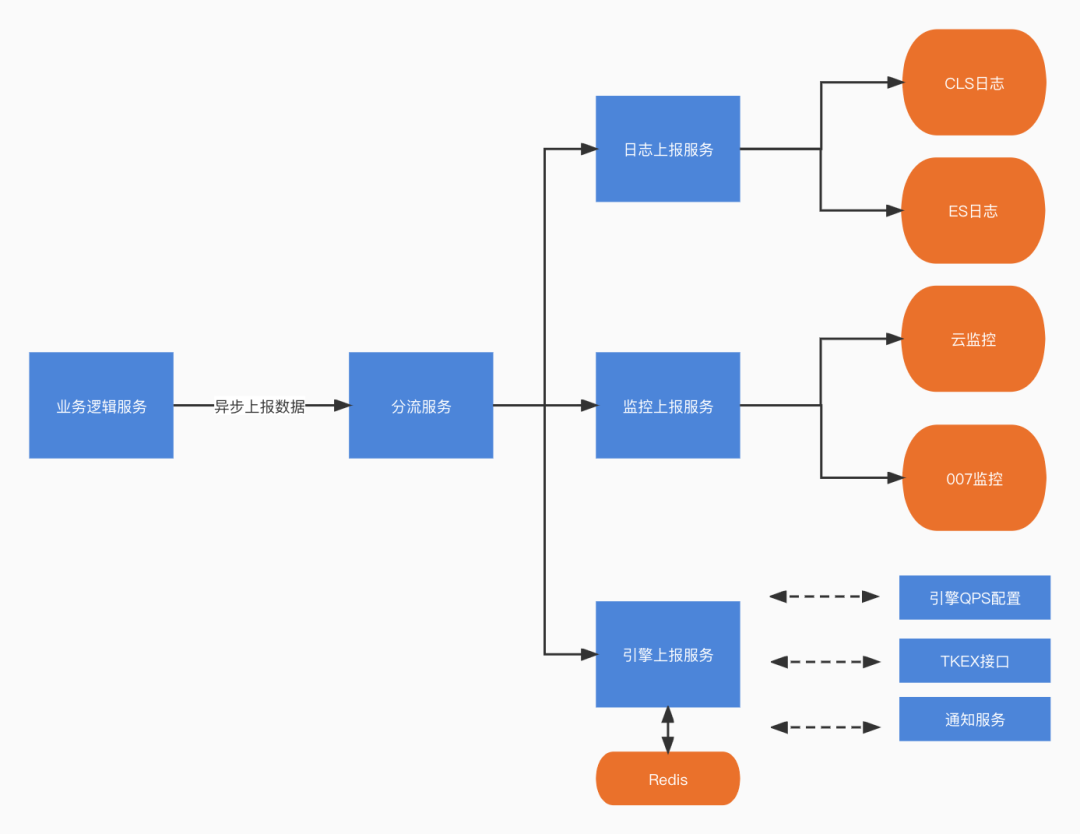 在业务中有很多关键节点需要记录日志,便于问题定位。在文字识别业务场景下,日志需要脱敏处理大量识别出的文本数据,写入速度慢。为了避免日志操作影响服务响应耗时,我们设计了日志分流上报服务,将日志操作全部通过异步流程上报到其他微服务完成,减少主逻辑耗时。