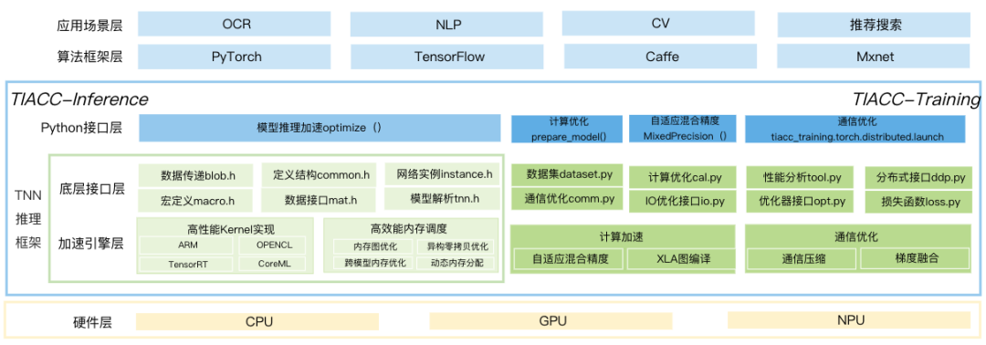 TIACC 底层使用了 TNN 作为基础框架,性能强大,其中 TNN 是优图实验室结合自身在 AI 场景多年的落地经验,向行业开源的部署框架。TIACC 基于 TNN 最新研发的子图切分功能基础上进行产品化封装,为企业提供 AI 模型训练、推理加速服务,显著提高模型训练推理效率,降低成本。