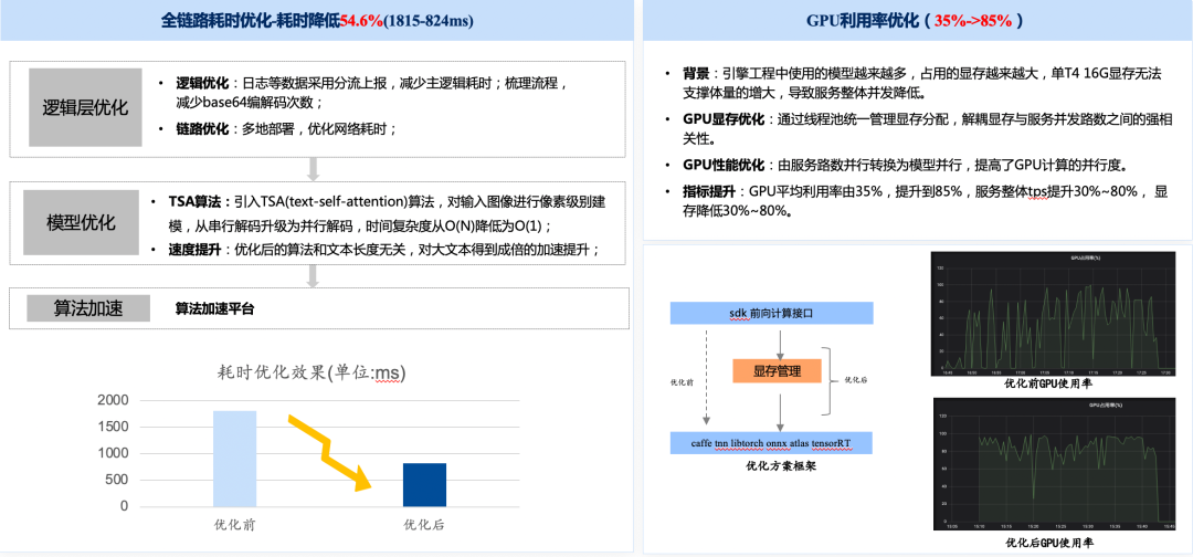 我们也成立了专项团队进行攻坚,从工程优化,模型优化,TI-ACC 优化等方面发力,逐步降低服务耗时。优化前平均耗时 1815ms,优化后平均耗时 824ms,耗时性能提升 2.2 倍,并最终得到重要客户的肯定。