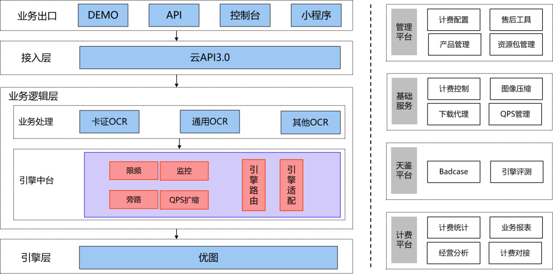 业务逻辑层:文字识别逻辑层服务会对数据做处理、下载、计费、上报等操作