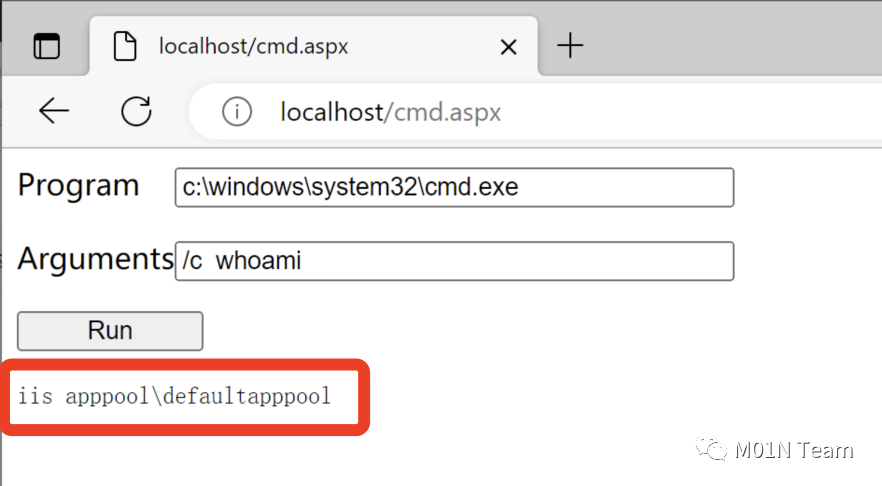 如果当前获取了IIS服务的WebShell,默认情况下IIS中进程所运行的账户为IIS程序池虚拟账户defaultapppool。下图为在IIS中上传执行命令的WebShell后运行whoami命令的结果。