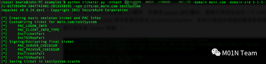 在成功获取Hash后,就可以制作DC中CIFS服务的白银票据,其中还需要域的SID和CIFS服务的SPN,这些信息都比较容易获取就不再赘述,最后需要指定一个任意的用户名。