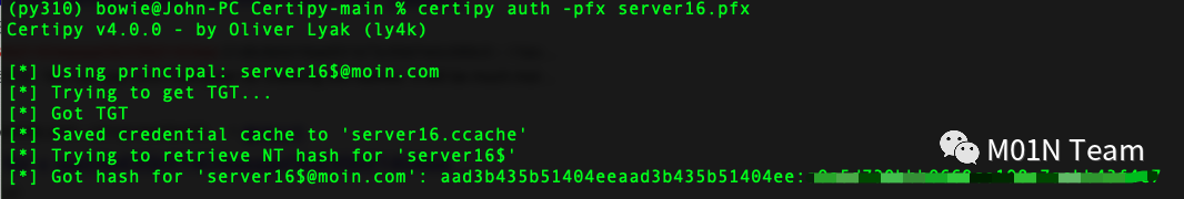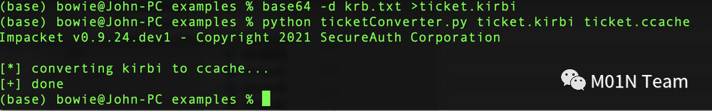 在获得TGT后,可以使用TGT申请AD CS证书,使用前需要转换为ccache格式才能写入环境变量。