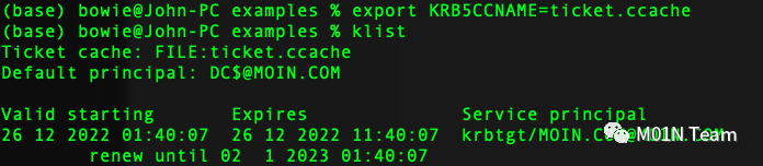在Linux系统中将票据写入环境变量KRB5CCNAME中即可用于身份认证,使用klist命令可以查看缓存中的票据。