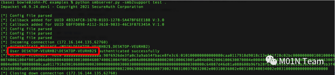 但是由于defaultapppool是虚拟账户不属于AD域。因此IIS中的进程在AD域中进行认证时,所使用的账户是所在主机的机器账户。下图是使用impacket开启SMB服务器并使用IIS中的Webshell访问SMB共享的结果,可以看到认证的账户是机器账户。