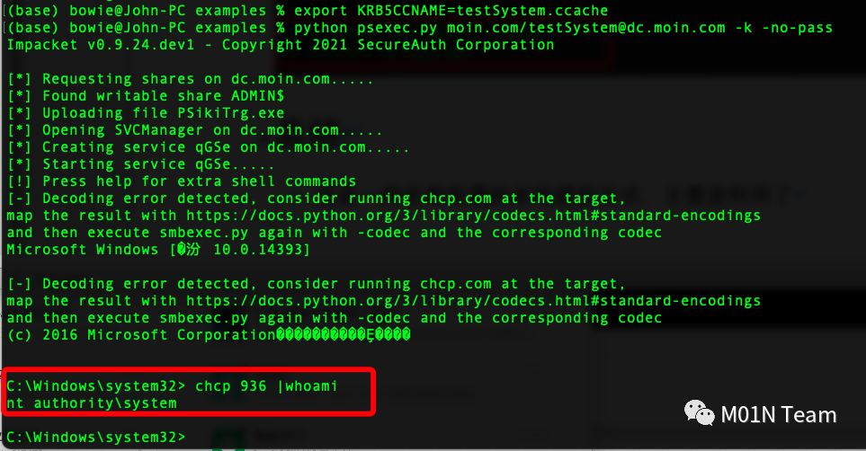再次将生成的白银票据写入缓存,并使用psexec进行横向。票据可用则会返回一个CMD的Shell,执行whoami命令发现当前为nt authority/system,此时已经成功将虚拟服务区权限提升到本地System权限。