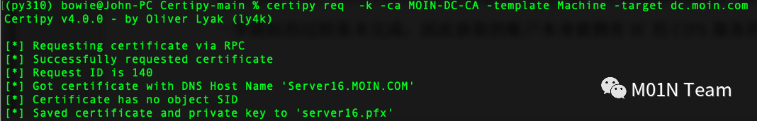 在成功将票据写入缓存中后,可以使用Certipy工具申请票据。此时注意需要为主机配置DNS信息防止无法根据名称找到CA服务器。此处申请了一个与主机名相同的pfx证书。申请的票据模板需要包含以下5个EKU之一,票据才能用于后续的身份验证: