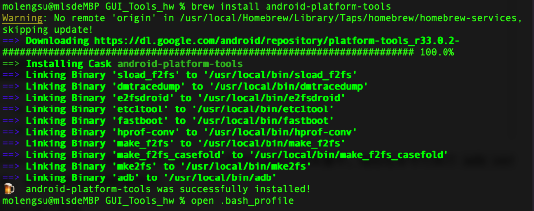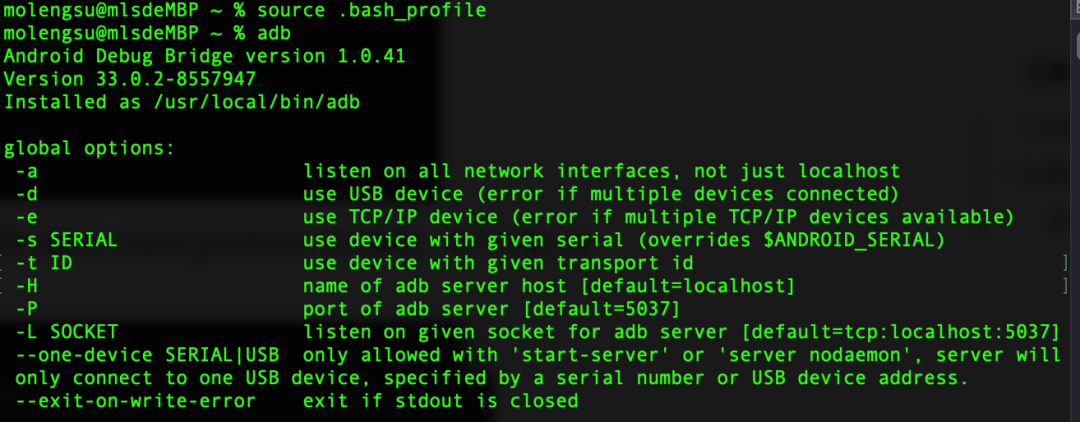 adb version查看adb版本,未出现报错安装配置成功。brew install android-platform-tools