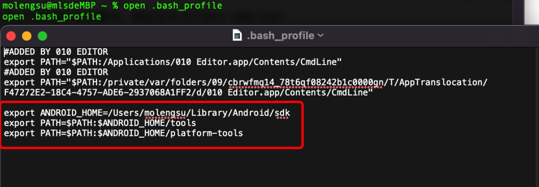 .bash_profile添加环境变量,使用open .bash_profile打开编辑,在下方插入如下代码export ANDROID_HOME=/Users/用户名/Library/Android/sdk