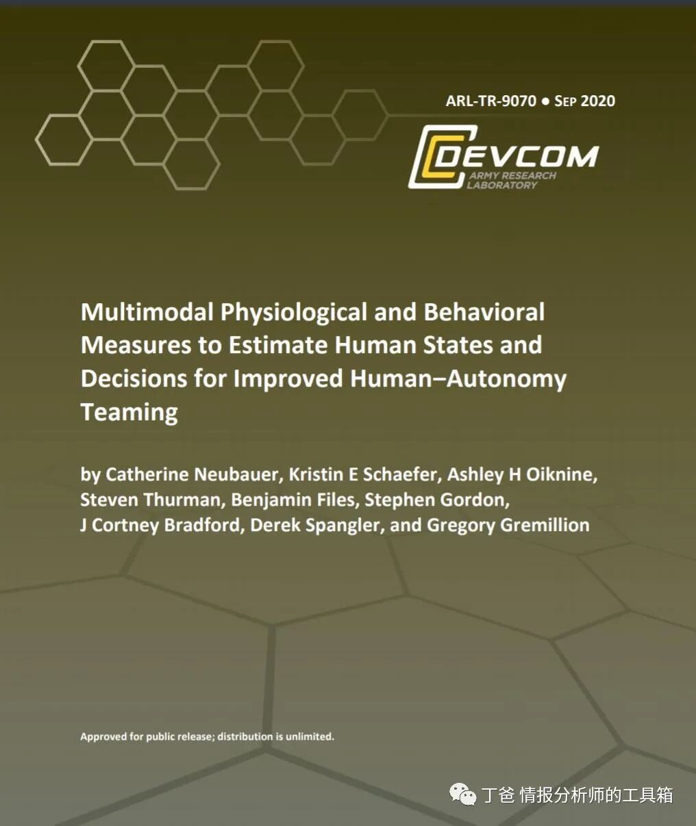 今天给大家推荐美国陆军作战能力发展司令部陆军研究实验室的文章《用多模态生理和行为测量来估计人的状态和决定,以改善人与自主性团队的协作关系》