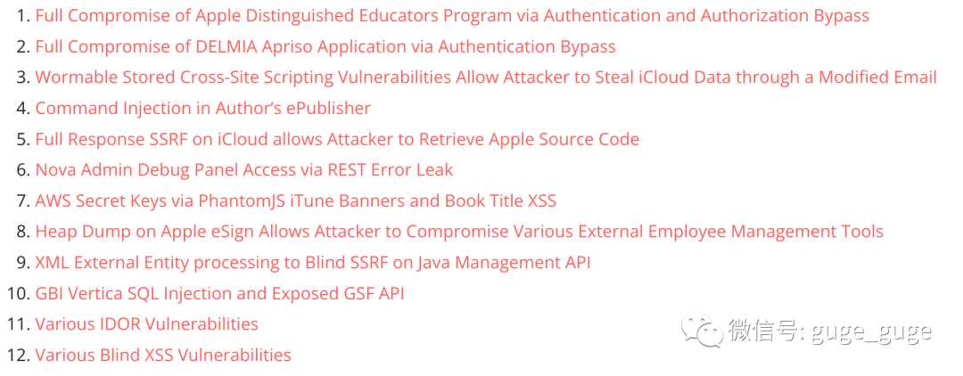 在整个测试过程中,他们在苹果的基础设施核心部分发现了各种漏洞,这些漏洞允许攻击者完全危害客户和员工的应用程序,启动能够自动接管受害者的iCloud账户的蠕虫,检索苹果内部项目的源代码,完全危害苹果使用的工业控制仓库软件,并通过访问管理工具和敏感资源的能力接管苹果员工的应用会话。