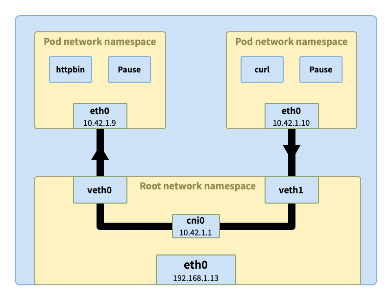 veth1 通过网桥 cni0 与其他 pod 相连虚拟以太接口 vethX 相连,网桥会询问所有相连的接口是否拥有原始请求中的 IP 地址(比如这里的 10.42.1.9)。收到响应后,网桥会记录映射信息(10.42.1.9 => veth0),同时将数据转发过去。最终数据经过 veth0 隧道进入 pod httpbin 中。