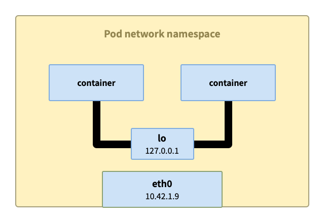 同 pod 内的容器间通信最简单,这些容器共享网络命名空间,每个命名空间下都有 lo 回环接口,可以通过 localhost 来完成通信。