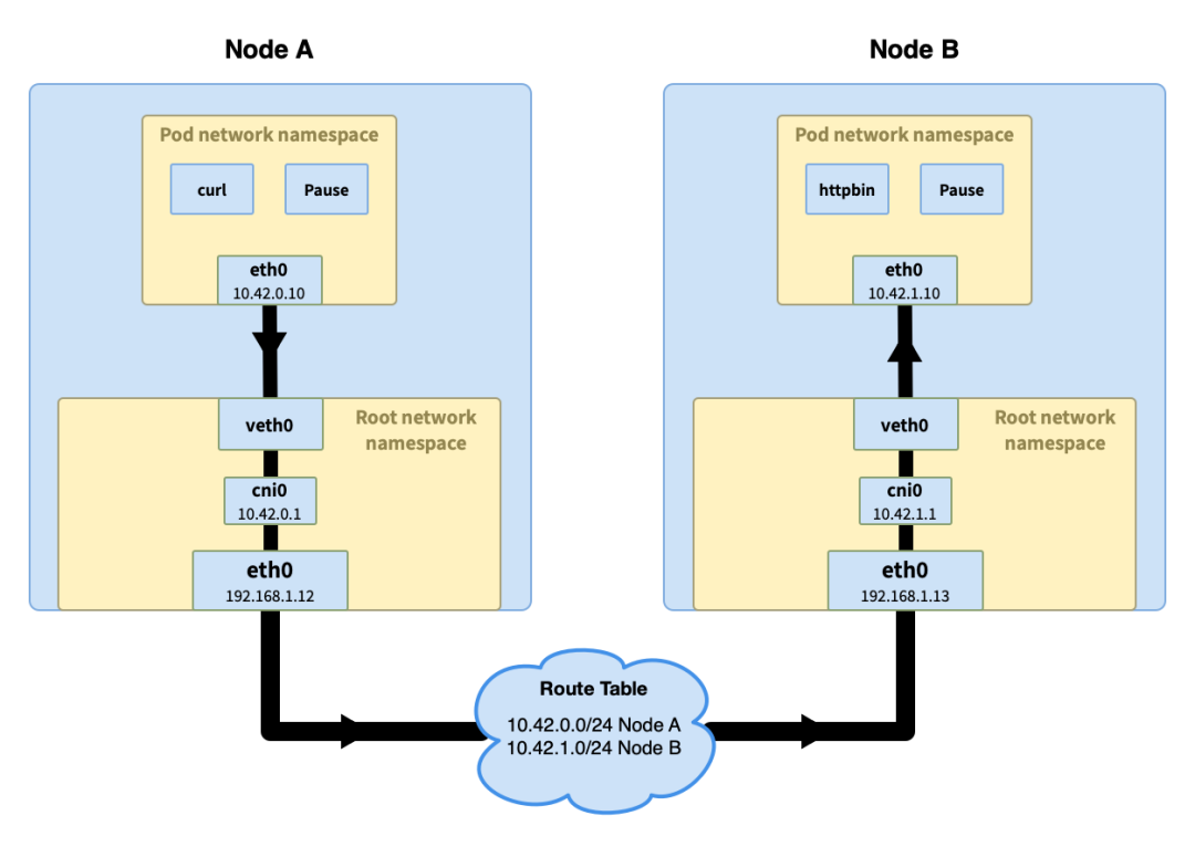 在集群层面有一张路由表,里面存储着每个节点的 Pod IP 网段(节点加入到集群时会分配一个 Pod 网段(Pod CIDR),比如在 k3s 中默认的 Pod CIDR 是 10.42.0.0/16,节点获取到的网段是 10.42.0.0/24、10.42.1.0/24、10.42.2.0/24,依次类推)。通过节点的 Pod IP 网段可以判断出请求 IP 的节点,然后请求被发送到该节点。
