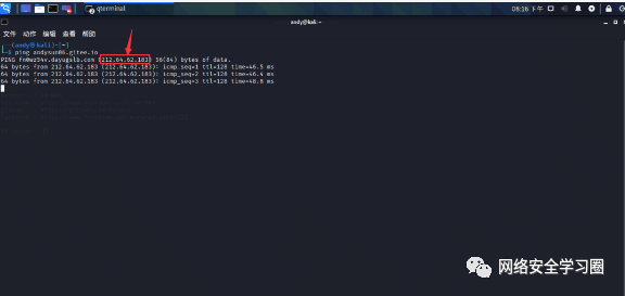 即可获得攻击对象的 IP 地址。(获取 IP 后 Ctrl+C 可以结束 ping)