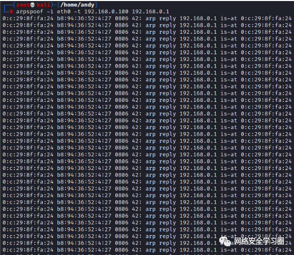arpspoof -i eth0 -t 192.168.0.100 192.168.0.1