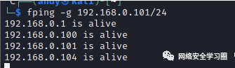 例如我的 IP 是 192.168.0.101,命令就是fping -g 192.168.0.101/24