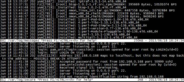 [[email protected] ~]# multitail -i /var/log/messages -i /var/log/secure #-i 指定一个文件名