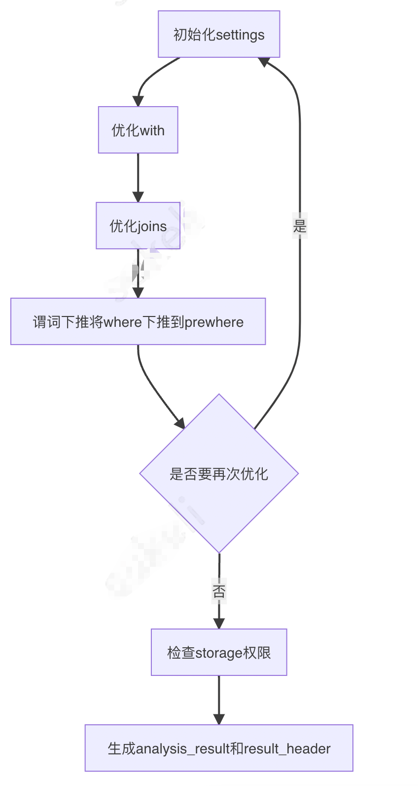 是否初始化 settings 优化 with 优化 joins 谓词下推将 where 下推到 prewhere 是否要再次优化检查 storage 权限生成 analysis_result 和 result_header
