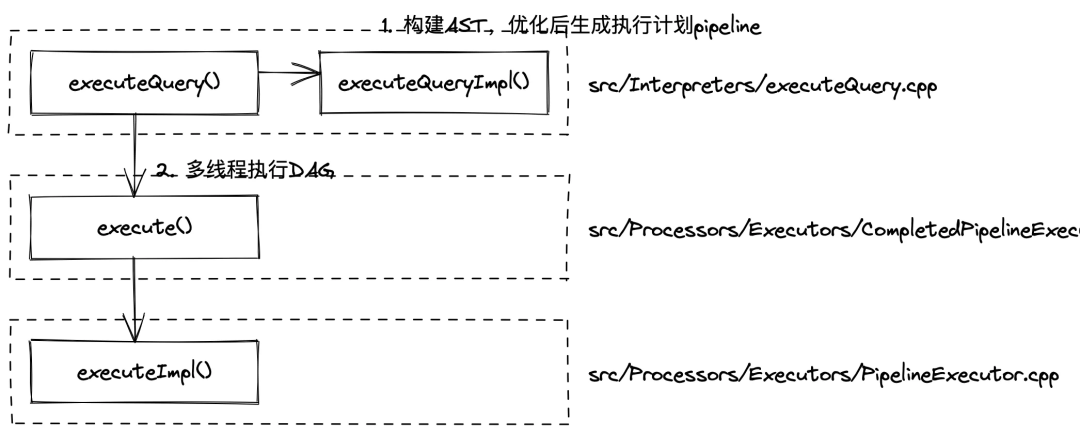 clickhouser-server启动后会在 while 循环中等待请求,接收到查询后会调用executeQueryImpl()行数构建 AST、优化并生成执行计划 pipeline,最后在executeImpl()中多线程执行 DAG 获取结果,这篇文章只关心 SQL 执行,省略掉网络交互部分,查询执行流程如下图所示: