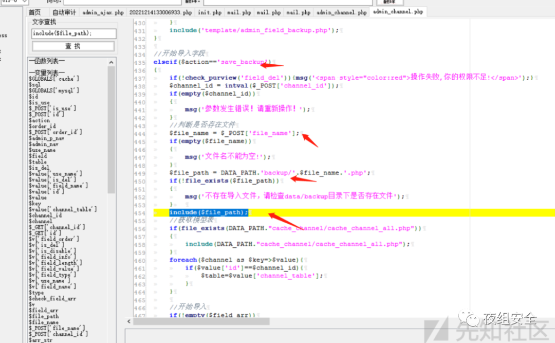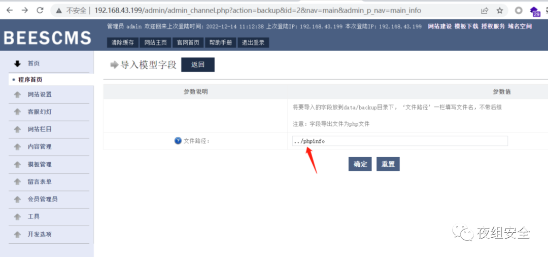 发现在admin_channel.php-导入字段这里就是backup,需要我们输入路径,然后我在上级目录写了一个phpinfo.php文件,通过../phpinfo这样的方式来包含