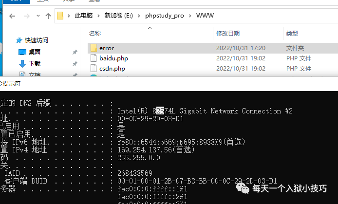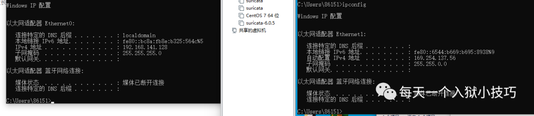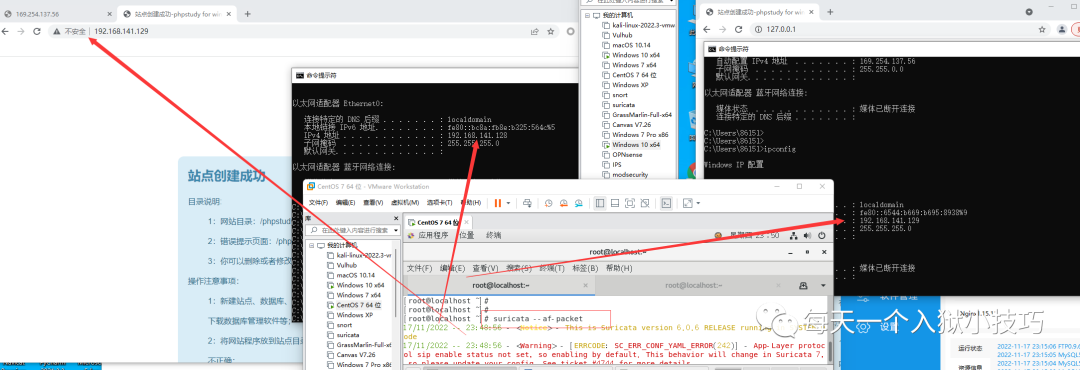 攻击机和靶机的ip,可以看到攻击者和靶机并不是一个网段,但是当suricata启动之后,自身所带的两个网卡就会相互复制流量,这时候suricata的作用就会相当于一根网线,将靶机攻击机和靶机连接起来,攻击者就可以访问靶机了