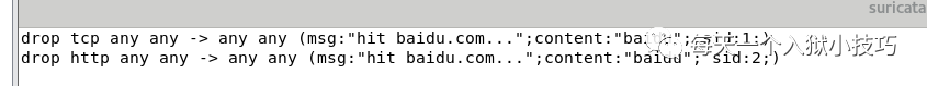 随便写条测试规则。因为现在是ips,所以动作要换成drop; alert 记录所有匹配的规则并记录与匹配规则相关的数据包; drop ips模式使用,如果匹配到之后则立即阻断数据包不会发送任何信息