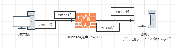 大概就是这样串进去就行了,注:这里是选择的IPS模式,所以需要两个网卡,一进一出,Suricata将负责将数据包从一个接口复制到另一个接口。复制过程中过一遍内置规则集,发现命中则拦截阻断此流量