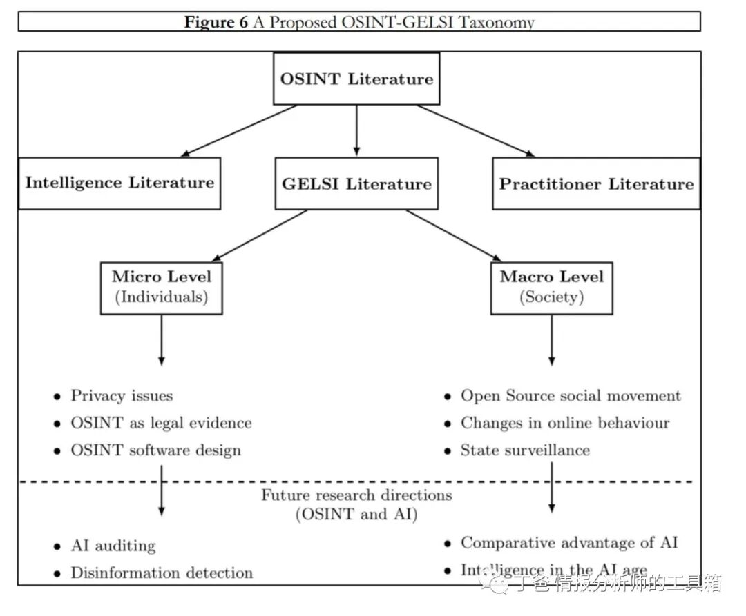 在图6的底部列出了一些建议,用于未来研究开源情报(OSINT)和人工智能(AI)在微观和宏观层面的相互作用。随着人工智能(AI)算法与日常开源情报(OSINT)实践紧密交织,我们发现这些发展最有可能发生在即将到来的开源情报(OSINT)文献中。