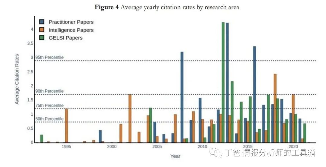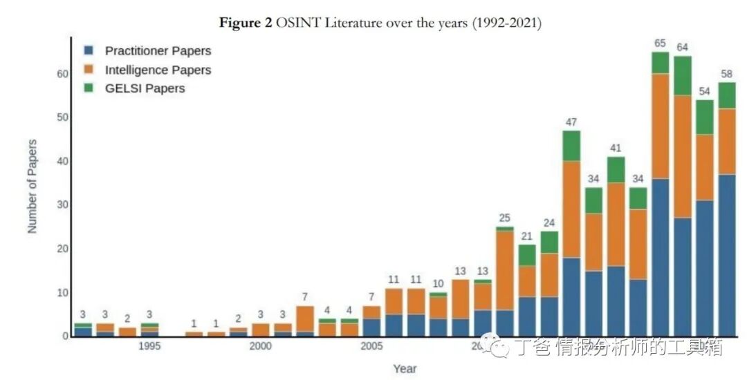GELSI主题的论文仅占整个语料库的12%左右,而其余的论文则平均分为从业者和情报两个部分。在图2中,我们可视化了开源情报(OSINT)文献在过去三十年中的演变。