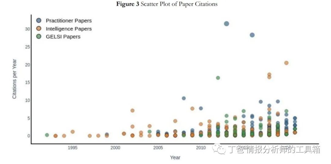 以及处理这些工具的法律框架。看看上面的图表,这种需要似乎只得到了部分解决。实际上,治理、伦理、法律和社会影响(GELSI)学术研究仅仅是更广泛的开源情报(OSINT)文献中仅次于出版物的数量。然而,人们也可能有兴趣检查每个出版物对其他出版物的影响力。图3显示了每篇论文每年收到的引文数量,用引文数量除以发表以来的年数。除了从业者和情报文献中几个非常有影响力的异常值外,大多数论文每年都围绕相同的引文绩效进行聚类,无论研究领域如何。在过去几年中可以发现略有上升的趋势,这与出版物数量的总体增长相符。