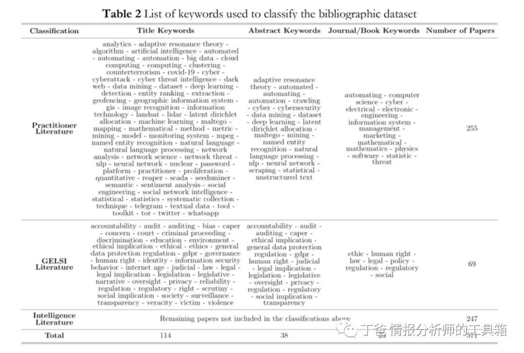 一旦从业者文献被从我们的数据集中删除,我们留下我们所定义的情报文献,即那些处理开源情报(OSINT)作为学科的文档。这又是一个宽泛的分类,除其他主题外,包括学科出现和演变的历史描述,关于开源情报(OSINT)应用的案例研究,以及对使用开源情报(OSINT)优于标准智能的优缺点的理论研究。从开源情报(OSINT)文献的这个领域,我们试图提取任何与治理、伦理、法律和社会影响(GELSI)框架相关的文章。为此,我们对论文标题、摘要和期刊名称进行了第二次关键字搜索。在表2中提供了用于标识每个链的关键字列表及其位置。使用的一些关键词非常具体(针对在关键词搜索之前确定的特定论文)。然而,大多数是通用的,可以在开源情报(OSINT)语料库之外应用。这种做法并非没有问题。事实上,一些论文可能在任何领域缺乏指定的关键词,因此属于情报类别,而属于其他两个之一。此外,一些条目可以是难以分类,其内容不完全适合上述任何类别。然而,对结果数据集条目的直接和仔细检查显示,只有一小部分论文被错误分类。这一错误已得到纠正。大多数问题只涉及从业者和情报部门之间的一些微小重叠,这不是本审查的重点。