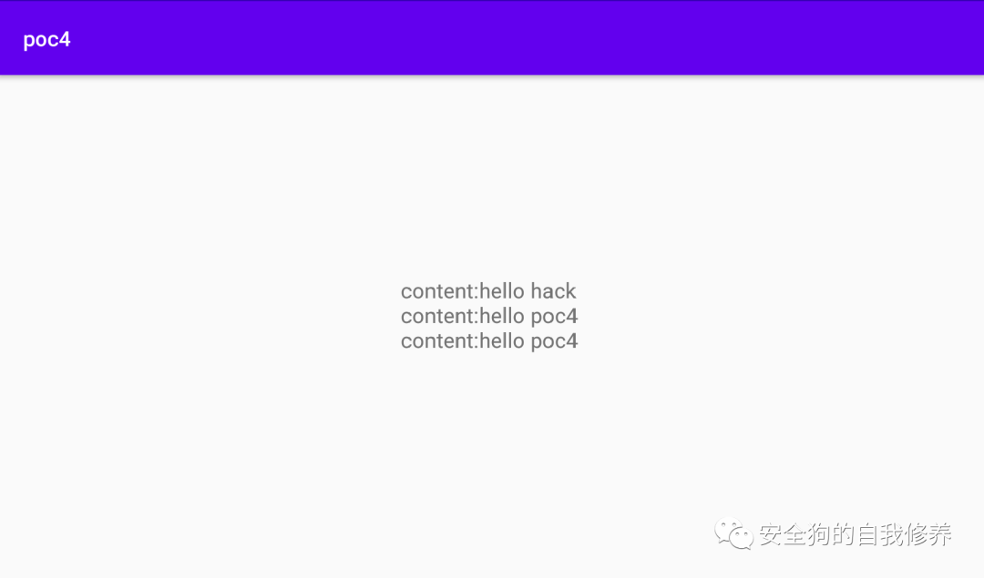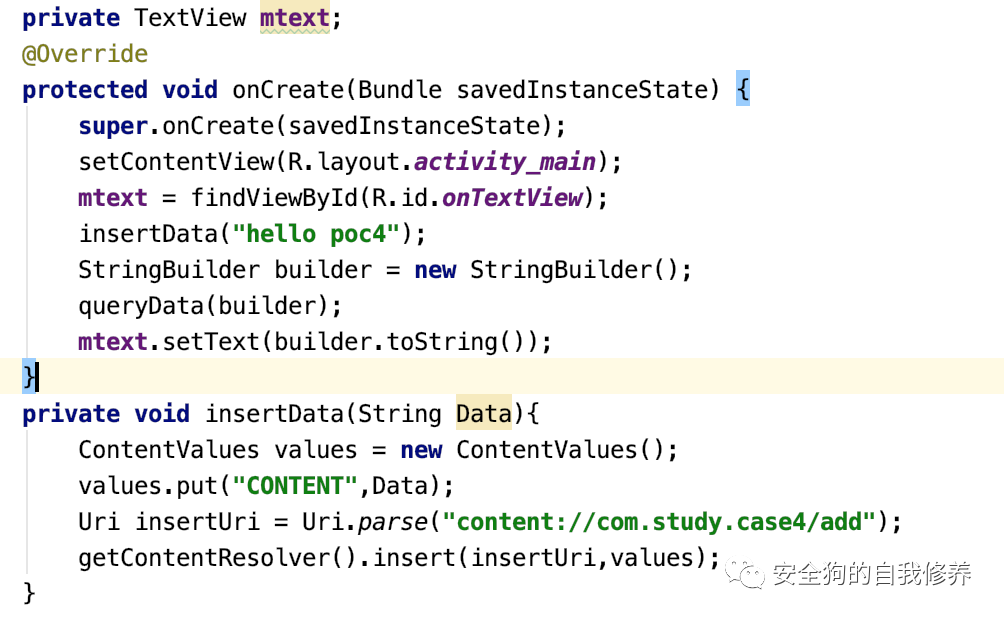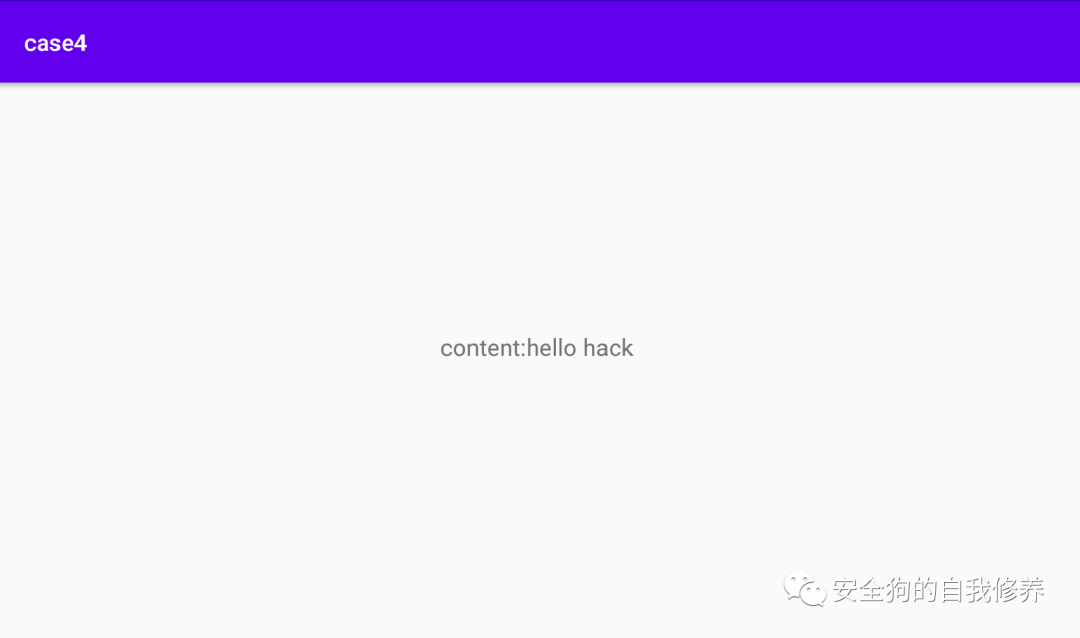 为了学习这个自定义权限,我编写了一个case4应用。功能很简单,应用启动时创建一个名为case4.db的数据库并生成表名称为hack的数据表。表中有两个字段 _id(key键并且自增长)和CONTENT(text字段)。初始写入表中数据为“hello hack”。