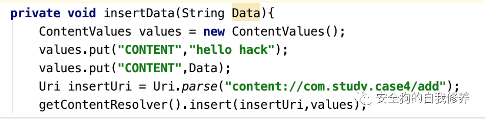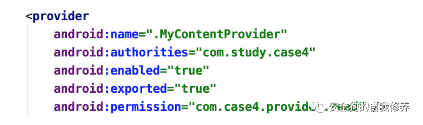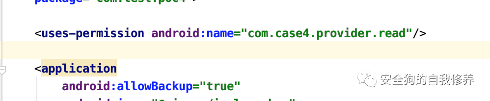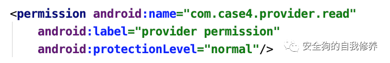 外部App调用Content Provider组件时使用相应的uri即可完成数据查询或插入。case4应用为Content Provider组件声明了自定义权限,如下: