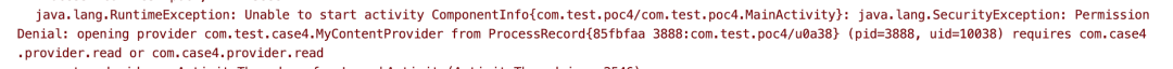 第一次运行 poc没有添加 “com.case4.provider.read” 权限时,运行报错。