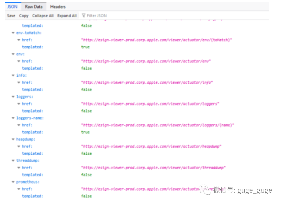 由于无法从该页面访问任何链接或有趣的 js 文件,因此他们使用一些基本的爆破字典进行目录扫描,看看能否找到一些应用程序的站点,成功发现 /viewer/actuator ,其中包括映射和heapdump: