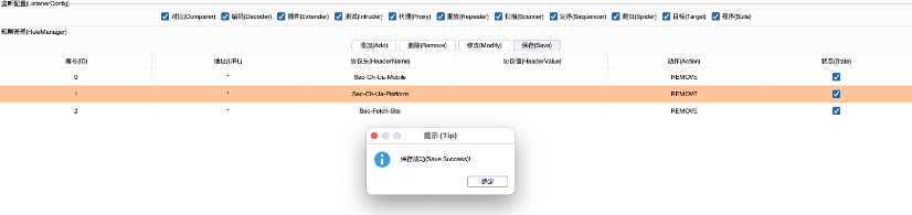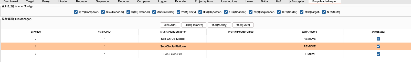 3、编写规则来去除 Sec-Ch-Ua-Mobile Sec-Ch-Ua-Platform Sec-Fetch-Site 这几个头信息,并点击状态为启用。