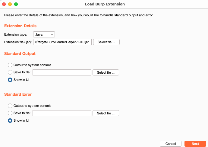1、加载插件: Extender -> Burp Extensions -> Add -> Select File... -> Next -> BurpHeaderHelper-xxx.jar