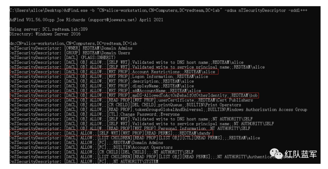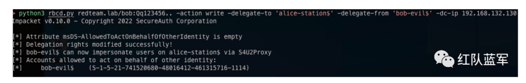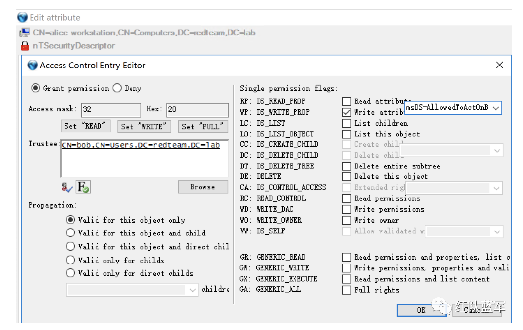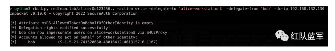 跟上面一样,alice-station由alice拉入域中,所以alice具有alice-station$域用户的 **msDS-AllowedToActOnBehalfOfOtherIdentity的 WriteProperty权限。** 设置bob到alice-station$到bob的rbcd:
